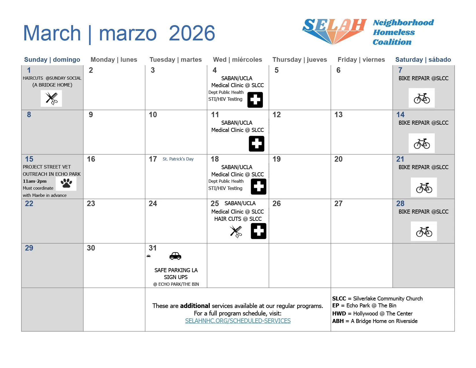 Hot showers, hot meals, hot coffee, clothing, food, hygiene items, bike repair, phone charging and help with special services like ID replacement and EBT applications. SELAH Legal Assistance is on site once a month.Duchas, comidas, café, ropa, comida, artículos de higiene, reparación de bicicletas, carga de teléfonos y ayuda con servicios especiales como reemplazo de identificación y solicitudes de EBT. La Asistencia Legal de SELAH está presente una vez al mes.