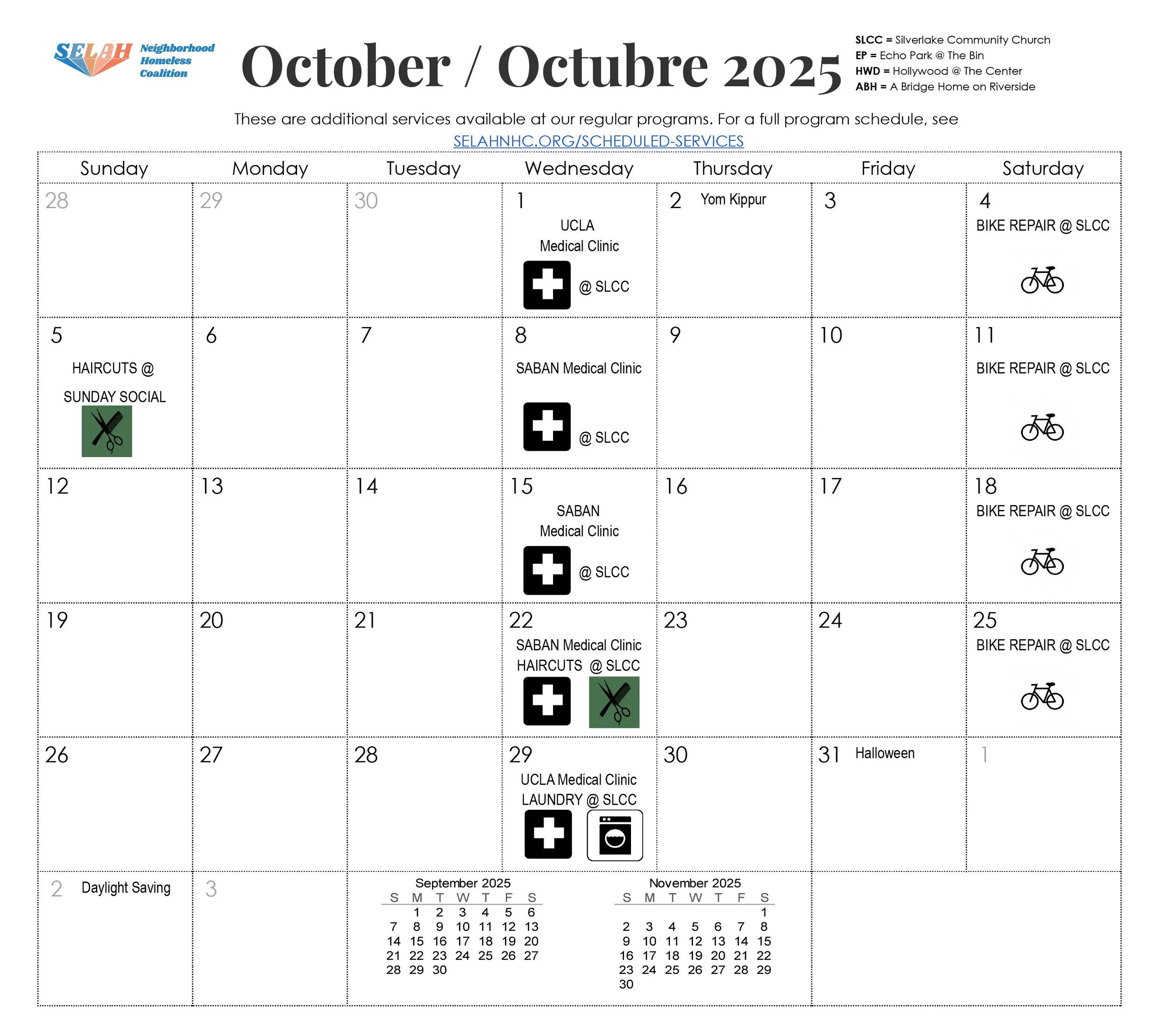 Groceries, hot coffee, food, clothing, hygiene items, phone/device charging and help with special services like ID replacement and EBT applications. UCLA doctors and Saban medical teams are on site once a month.Abarrotes, café, comida, ropa, artículos de higiene, carga de teléfonos y ayuda con servicios especiales como reemplazo de identificación y aplicaciones EBT. Los médicos de UCLA y los equipos médicos de Saban están en el lugar una vez al mes.